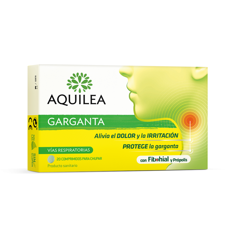 Es un producto sanitario que contiene Fitohial®, un complejo molecular a base de Grindelina, Salvia y ácido hialurónico que calma el dolor de garganta gracias a la formación de un film protector mucoadherente. Además, este film forma una barrera que protege la garganta y la mucosa orofaríngea de los agentes externos. Aquilea Garganta contiene también própolis y aceites esenciales de clavo y naranja.