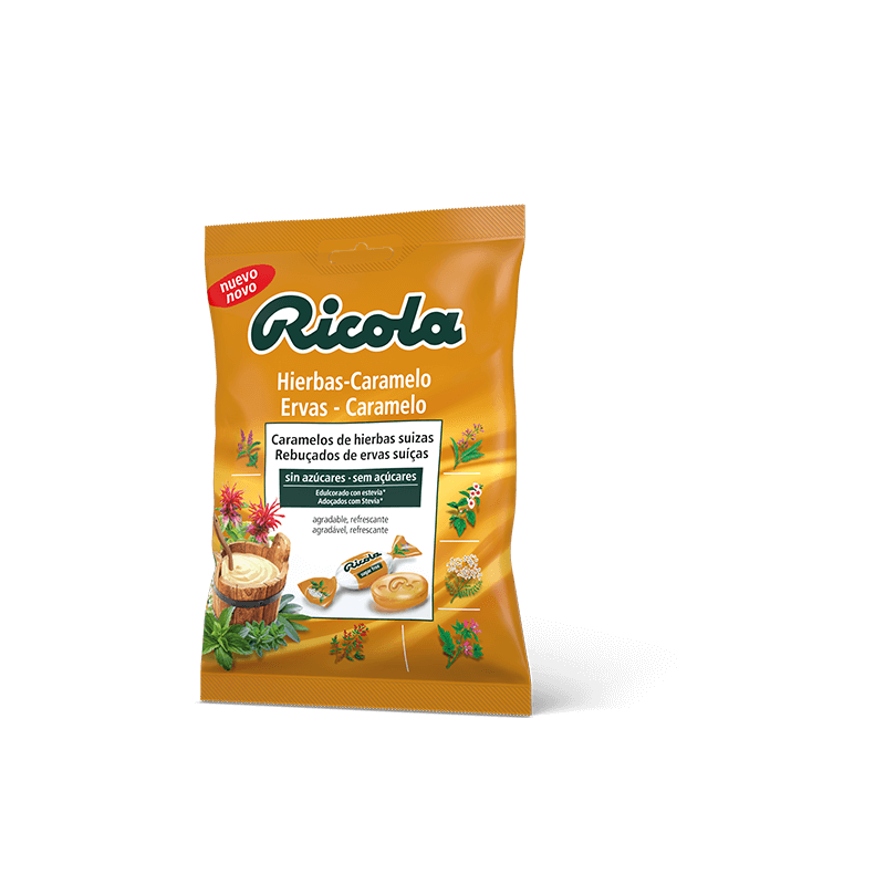 El caramelo de Ricola de hierbas-caramelo y la eficaz mezcla de 13 hierbas revela una audaz relación: el caramelo fascina por su combinación de caramelo suave y dulce, complementado con un ligero toque de sal alpina suiza. El resultado es un exquisito caramelo con sabor a hierbas y caramelo. La aventura de sabor se define como oro suizo para el paladar.