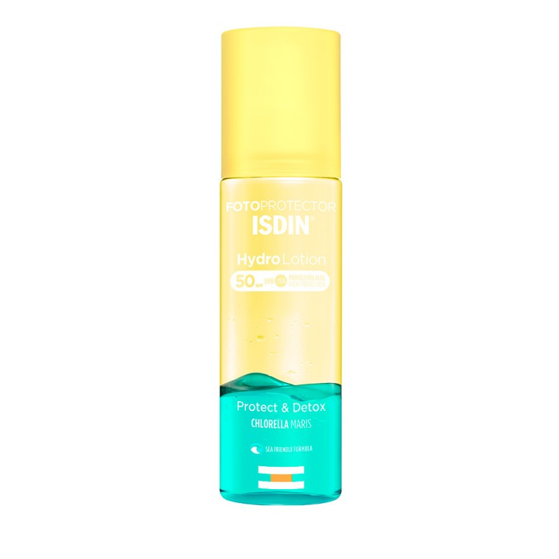 Fotoprotector corporal bifásico hidratante de secado inmediato. Con Chlorella Maris que evita la oxidación de la piel. Alta protección UVB/UVA SPF50.