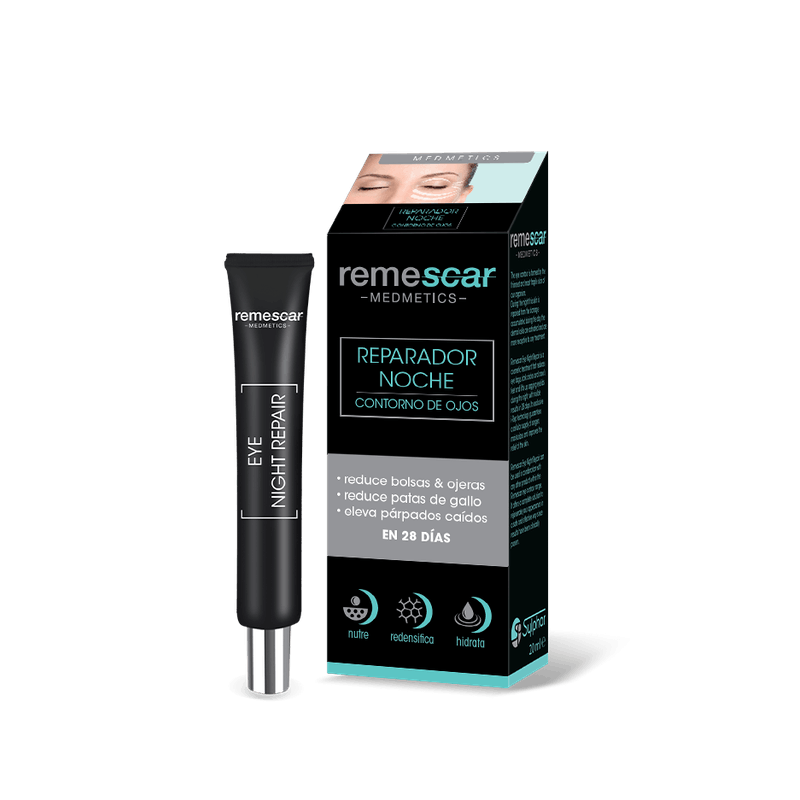 Remescar Reparador Noche Contorno de ojos es un tratamiento cosmético que reduce bolsas y ojeras, patas de gallo y eleva párpados caídos durante la noche con resultados visibles en 28 días. Su tecnología i-Rep, garantiza un aporte celular de oxígeno, hidratación y mejora el aspecto de la piel.