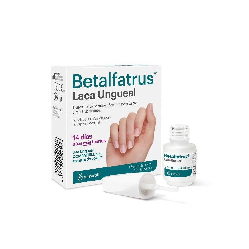 Betalfatrus® es una laca hidrosoluble invisible, fácil de usar y de secado rápido desarrollada con la Tecnología Transungual Delivery. Crea una película invisible (sin brillo ni olor) y soluble en agua, lo que significa que no requiere el empleo de disolventes para su eliminación, solo agua.