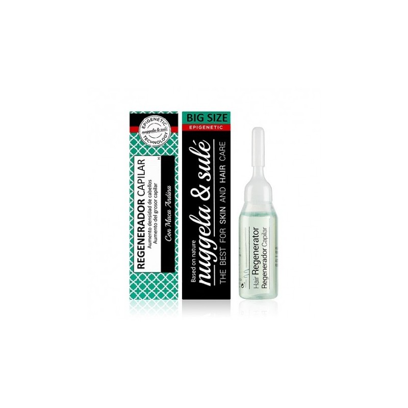 Nuggela Regenerador Capilar Ampolla 10 ml es un tratamiento capilar intensivo para regenerar la densidad capilar y restaurar el volumen normal del cabello. Cada ampolla contiene un concentrado de activos, vitaminas y oligoelementos que gracias a la maca andina, actúa sobre el cuero cabelludo mejorando su salud y potenciando su recuperación, especialmente, en zonas despobladas.