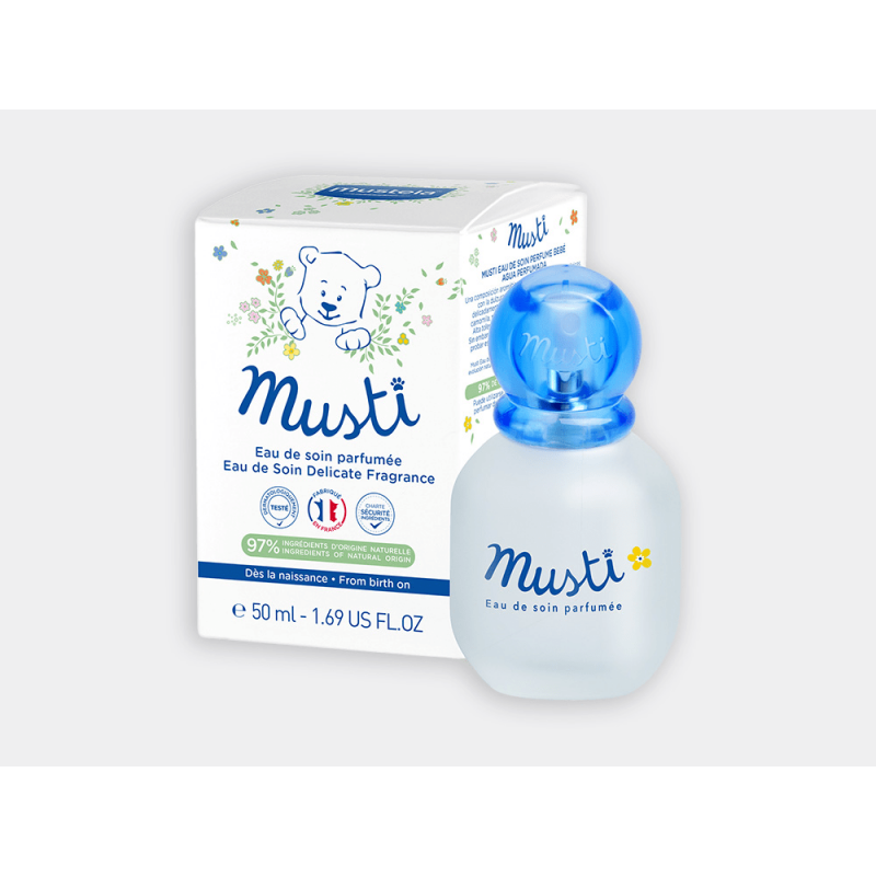 El Eau de Soin Musti perfuma delicadamente al niño y al bebé, aportando un toque de frescor y de ternura gracias a sus notas sutiles de cítricos, de rosa y de lila. Se puede utilizar desde el nacimiento de manera totalmente segura.