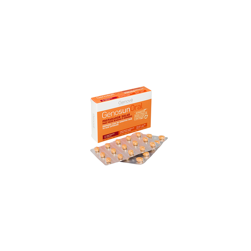 Genosun® Oral es el preparador solar específicamente indicado para pieles blancas o sensibles, de alta eficacia gracias a su exclusivo complejo Astaxactive®, a base de Astaxantina, Vitamina E y β-caroteno, para preparar la piel para la exposición solar, protegiendo el 100% de la superficie dérmica, y retrasar la aparición del eritema solar.