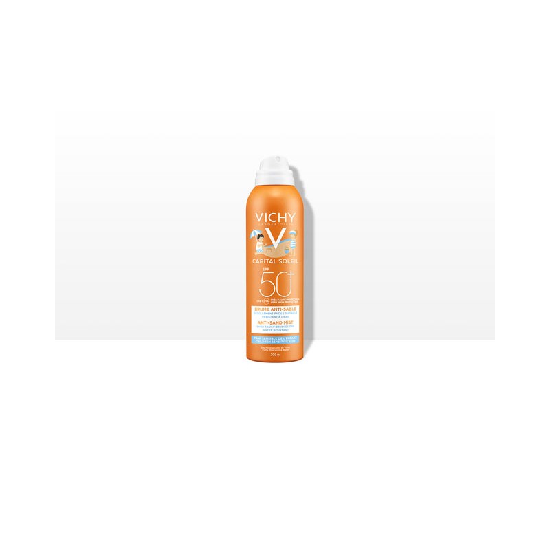 Agua Termal Mineralizante de Vichy calmante, fortificante y regenerante. La arena se desprende fácilmente de la piel y se mantiene una alta protección para los niños.