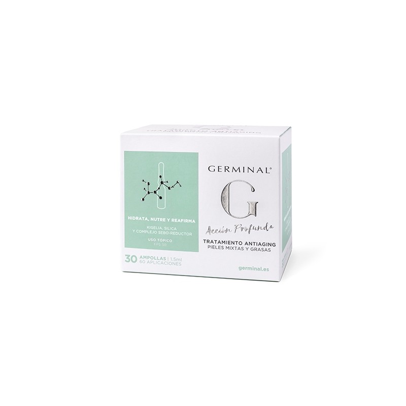 Germinal Acción Profunda Tratamiento Antiaging Pieles Mixtas y Grasas es un tratamiento con propiedades hidratantes y purificantes que normaliza la producción sebácea para conseguir una piel hidratada y un aspecto mate.