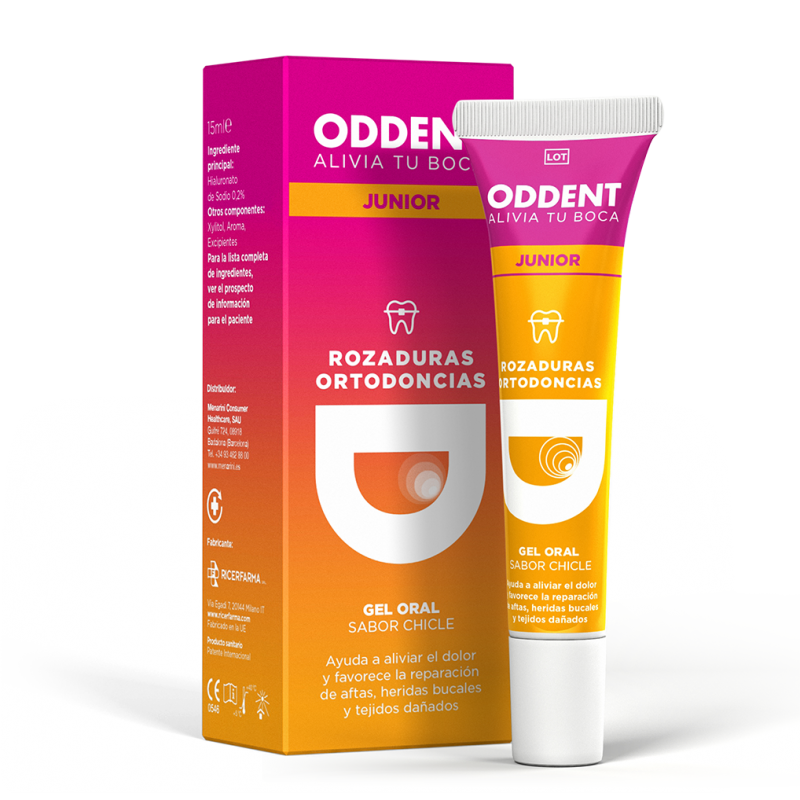 ODDENT® Gel Oral Junior está formulado para aliviar el dolor de heridas provocadas por ortodoncias y llagas bucales infantiles. Contiene ácido hialurónico y se aplica directamente sobre el tejido gingival o la zona a tratar, realizando un suave masaje con los dedos limpios, para ayudar a distribuir el gel sobre la mucosa.