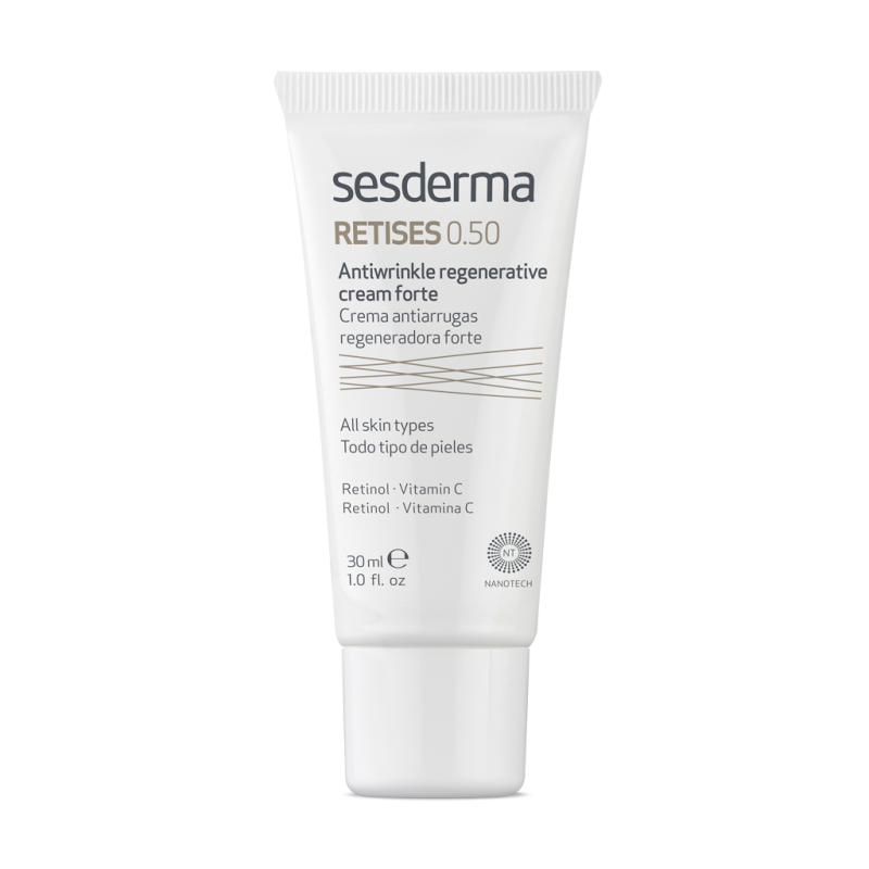 RETISES 0.5 es una crema de noche. Con una combinación perfecta de una alta concentración de retinol puro al 0.5% y ascorbil glucósido (vitamina C) al 1% para combatir los síntomas del envejecimiento de la piel. El Retinol puro es la forma más activa de la vitamina A, uno de los activos más eficaces contra las arrugas, indispensable para aumentar el contenido de colágeno y la regeneración natural de las células en la epidermis. Con efecto exfoliante, atenúa las manchas. Repara y protege de los daños que sufre nuestra piel con el paso del tiempo. La acción antioxidante de la Vitamina C aporta luminosidad y unifica el tono de la piel. Formulada con un conjunto de activos que se complementan: Solución de Palmitoyl Oligopeptide que estimula la síntesis de colágeno y glycosaminoglycanos reforzando la epidermis. Mejorando la elasticidad perdida con el paso de los años. Antarticina, aumenta el crecimiento de fibroblastos, consiguiendo una piel lisa e hidratada