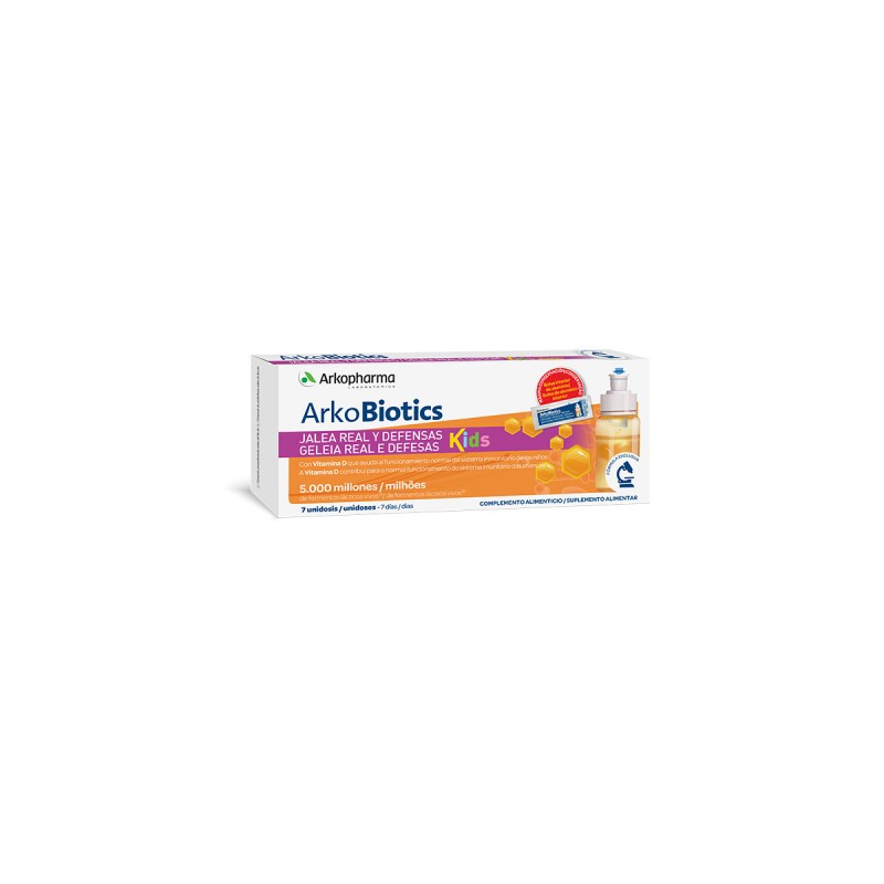 Arkobiotics® Jalea Real y Defensas es un complemento alimenticio a base de jalea real liofilizada, probióticos (fermentos lácticos vivos) y vitamina D.