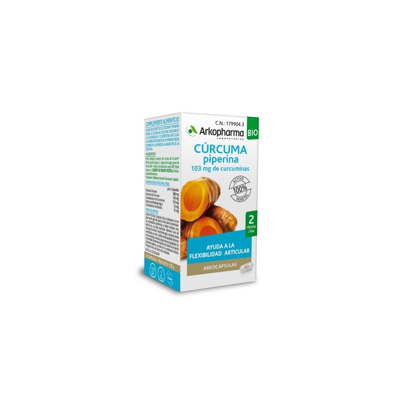 Arkocápsulas® Cúrcuma BIO es un complemento alimenticio a base de extractos de cúrcuma y pimienta negra.