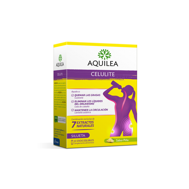 Aquilea Celulite es un remedio natural que contiene una exclusiva combinación de 7 extractos naturales que ayuda a eliminar los líquidos del organismo gracias a los extractos de plantas diuréticas y drenantes (cola e caballo, ulmaria y rabos de cereza), a quemar las grasas gracias al Guaraná y el té verde.