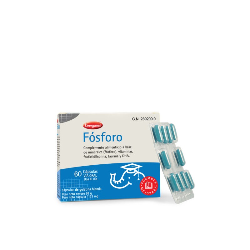 CEREGUMIL FÓSFORO cápsulas formula a base de fósforo, hierro, lecitina de soja rica en fosfatidilcolina, extracto de cáscara de ostra, taurina y vitaminas B1, B6 y E