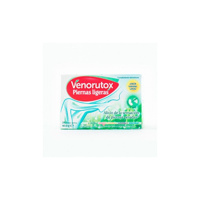 Venorutox Piernas Ligeras Sabor Naranja-Limón 20 Sobres es un complemento alimenticio para aliviar el cansancio de las piernas y activar su circulación. Está indicado para personas que permanecen mucho tiempo de pie. Funciona a través de los activos de centella asiática que favorecen la circulación venosa de las piernas, el rusco que las alivia y revitaliza, la vitamina C para beneficiar la formación del colágeno, la vitamina E actúa contra el daño oxidativo y el magnesio que contribuye a reducir el cansancio.