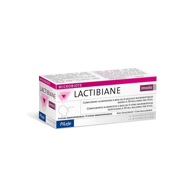 Lactibiane Imedia contiene 4 cepas microbióticas dosificadas a 30 mil millones por stick: