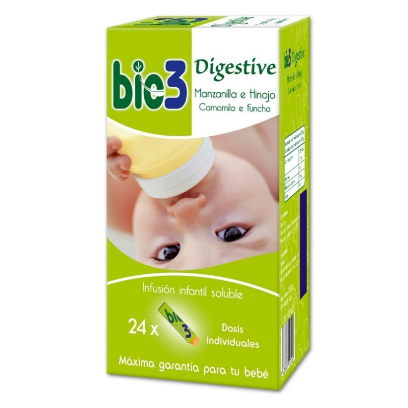Bie3 Digestive es una infusión soluble especialmente indicada para lactantes y niños pequeños. Elaborada con el corazón de flores de manzanilla silvestre y con hinojo.
