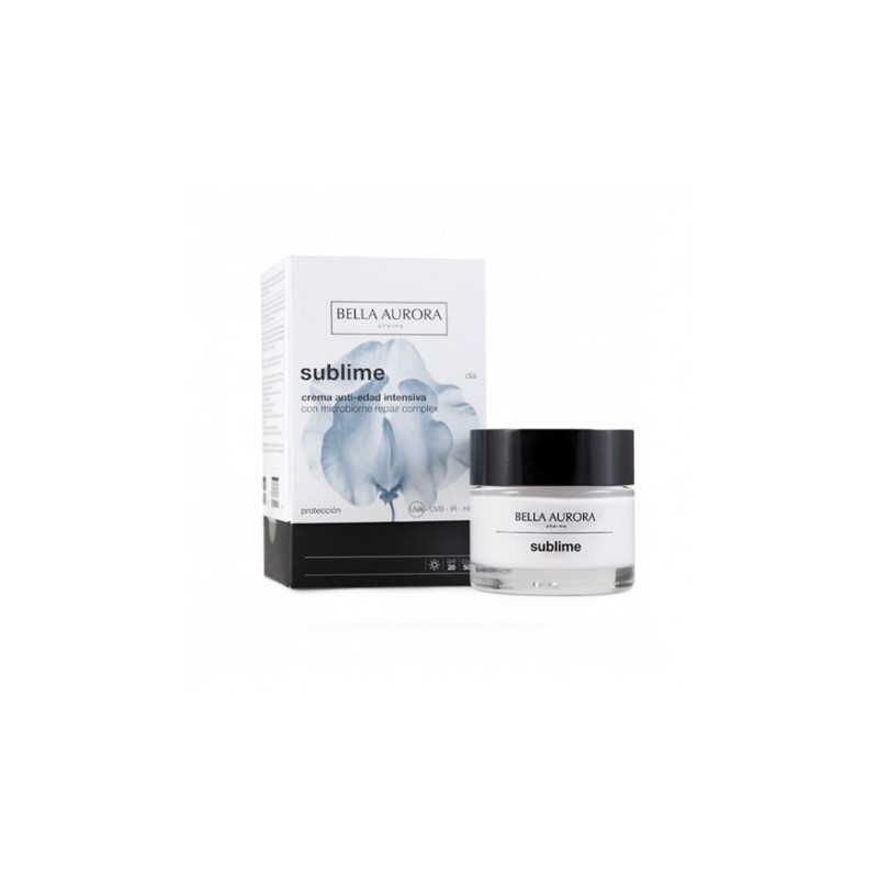 Bella Aurora Crema Anti-edad Intensiva Sublime 50 ml es una crema anti-edad que mantiene la hidratación de la piel y retrasa los signos del envejecimiento. Su fórmula fortalece la adhesión de la microbiota beneficiosa y promueve su equilibrio, mejorando la respuesta inmune y reforzando la barrera física. Tiene activos despigmentantes que atenúan las manchas oscuras y filtros solares para prevenir el fotoenvejecimiento. Ilumina el rostro.