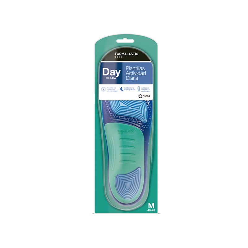 Las plantillas DAY Farmalastic Feet ayudan a absorber los impactos de forma eficaz y a reducir la presión que los pies soportan a lo largo del día. Proporcionan mayor estabilidad y soporte en el arco plantar y amortiguación en metatarso y talón.