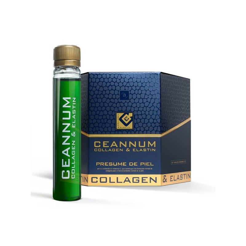 CEANNUM en viales bebibles, es un nutricosmético formulado con altas dosis de biopéptidos de colágeno tipo I y elastina, componentes presentes de forma natural en la piel, además de vitamina C, que contribuye a la formación normal de colágeno para conseguir una función adecuada de la piel.