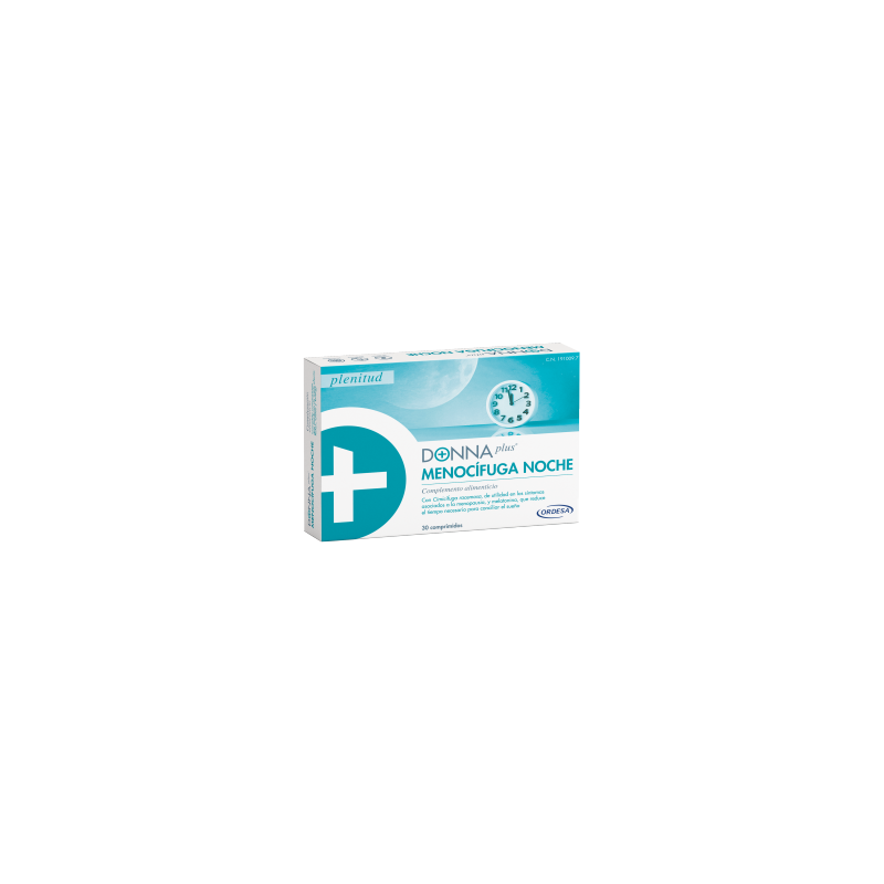 DONNAplus Menocifuga Noche es un complemento alimenticio que combina en su composición la Cimicifuga racemosa, planta de uso tradicional en caso de sofocos e irritabilidad asociados a la menopausia. Con Melatonina que contribuye a disminuir el tiempo necesario para conciliar el sueño, GABA y otros compuestos de utilidad en el mantenimiento de la mineralización ósea y la reducción del cansancio y la fatiga.