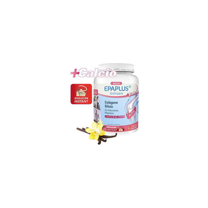 Complemento alimenticio con edulcorantes a base de colágeno, silicio, ácido hialurónico, calcio, vitaminas y minerales.