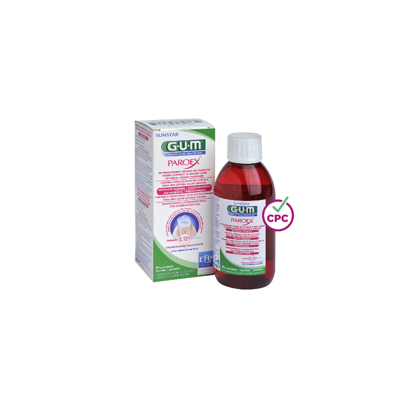 El colutorio de tratamiento GUM® Paroex® 0,12% es una solución a todos aquellos problemas de encías. Este colutorio tiene sabor a menta fresca y ayuda a reducir la placa, aliviar las encías sensibles y mantener las encías sanas. Es ideal para utilizarlo después de una cirugía o de una extracción dental.
