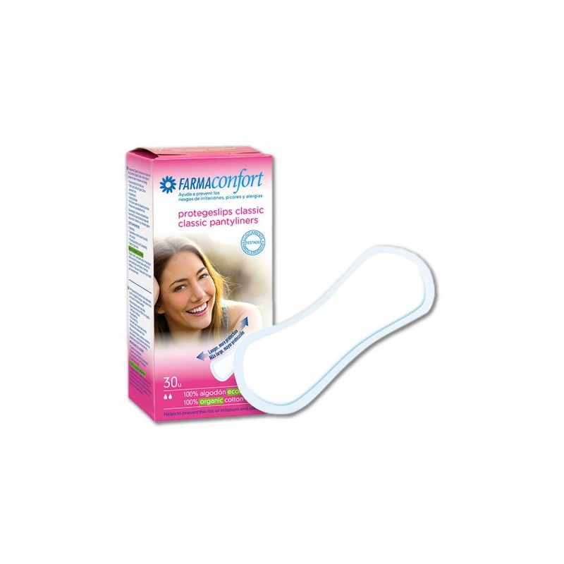 Los Protegeslips Anatómicos Classic FARMACONFORT están desarrollados con puro algodón ecológico 100%, hipoalergénico y dermatológicamente testado. El algodón ecológico es aquél que ha sido cultivado sin la utilización de fertilizantes químicos ni pesticidas.