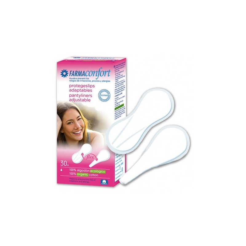Los Protegeslips Adaptables Flex FARMACONFORT están desarrollados con puro algodón 100% hipoalergénico, dermatológicamente testado.