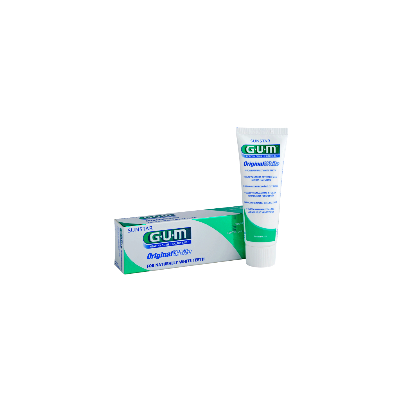 La pasta de dientes GUM® Original White es ideal para el uso diario. Esta pasta de dientes limpia los dientes con suavidad, al mismo tiempo que fortalece los dientes y las encías.