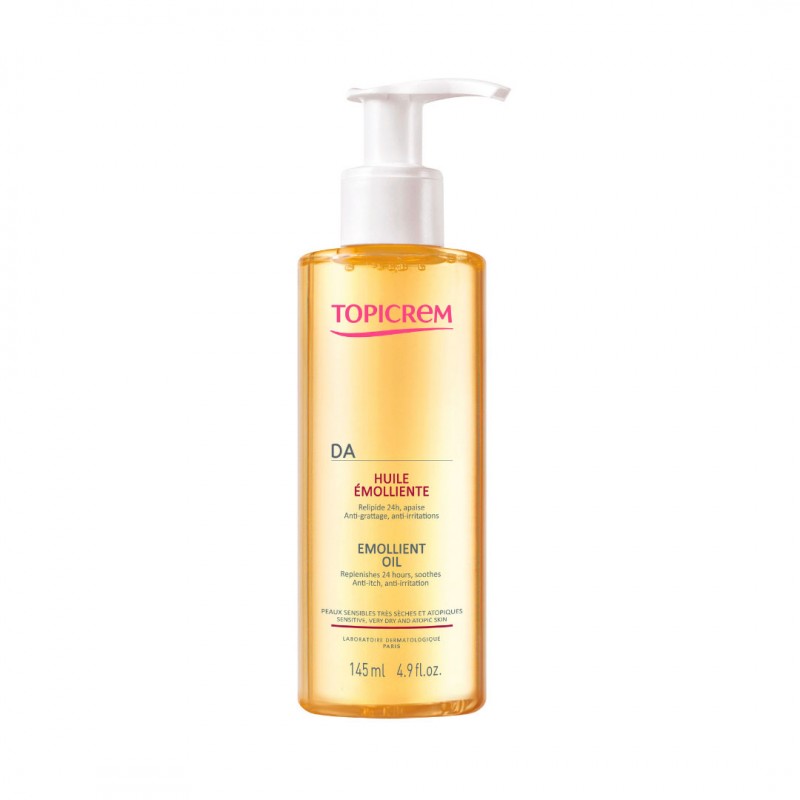 DA ACEITE EMOLIENTE es una innovación galénica y un tratamiento único para apoyar el tratamiento de la dermatitis atópica. Esta innovación galénica, el aceite “microemulsión” ofrece la fluidez de un aceite y el acabado no graso de una emulsión. Testado en pieles atópicas bajo control dermatológico y pediátrico. Aplicar 1 o 2 veces al día sobre la piel mojada o seca.