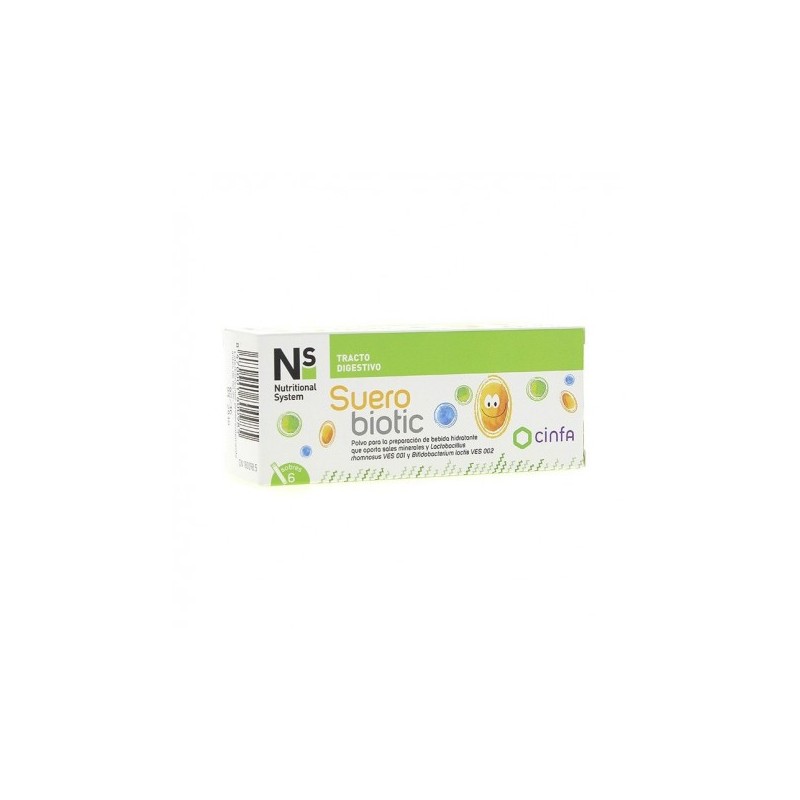 Ns Suerobiotic 6 Sobres Cinfa es un suero compuesto a base de minerales y probióticos que ayuda a restaurar los desequilibrios de la flora intestinal causados por infecciones, bacterias o diarrea.