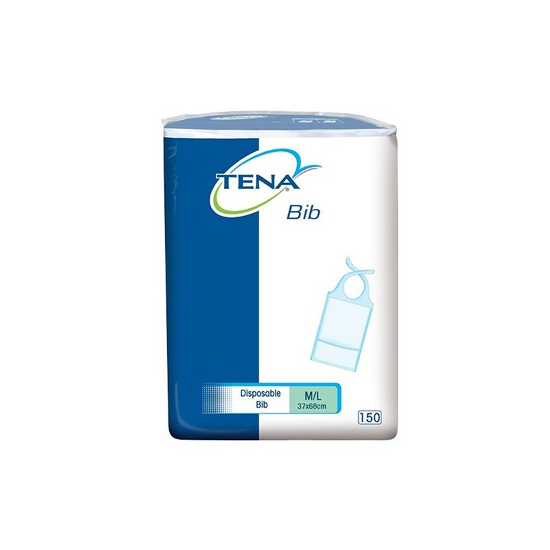 Práctico babero desechable con bolsillo delantero y cintas para atar, para una protección higiénica en las comidas.