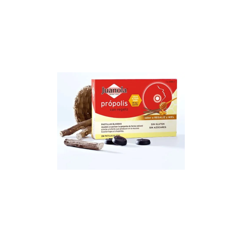 Juanola própolis con regaliz son unas pastillas blandas que combinan el efecto del extracto de própolis (28 mg/pastilla) y el extracto de regaliz o Glycyrrihiza glabra (46 mg/pastilla) para suavizar la garganta gracias al efecto que producen las pastillas en la mucosa bucofaríngea al chuparlas.