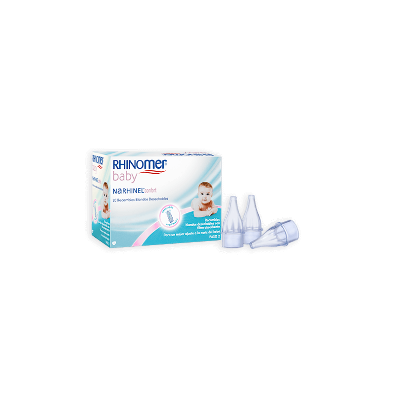 Los recambios del aspirador nasal Rhinomer Baby con un diseño suave y flexible contienen filtros absorbentes que garantizan la limpieza nasal de tu bebe