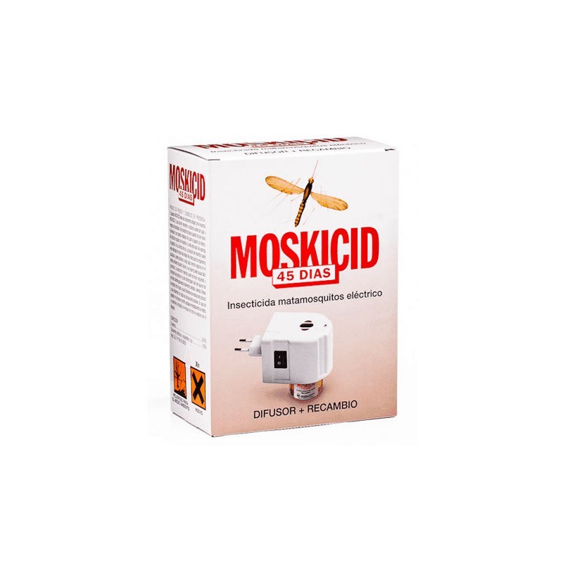 Moskicid 45 Dias Difusor + Recambio es un aparato eléctrico que se conecta a cualquier enchufe de la red y sirve para ahuyentar a los mosquitos mediante un liquido que se envuelve en el ambiente (no tóxico) y elimina a los mosquitos.