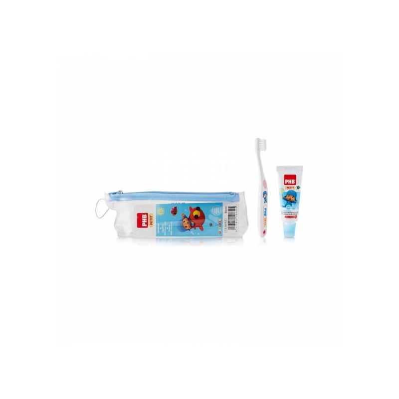 El neceser PHB Pocoyó contiene un cepillo PHB Plus petit y un gel dentífrico PHB de 15ml sabor fresa en un práctico neceser para que los peques puedan cuidar de su higiene dental en el cole, campamentos...