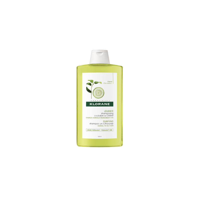 Destinado para los cabellos normales con tendencia a grasa, el champú a la pulpa de cidra Klorane libera al cabello y al cuero cabelludo de los residuos, neutraliza la cal y tonifica la fibra capilar.