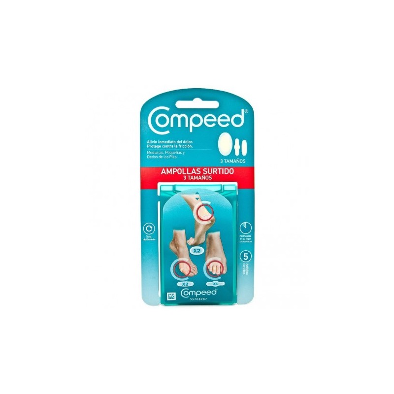 El pack incluye 2 apósitos ampollas medianas, 2 apósitos ampollas pequeñas y un apósito dedos del pie.