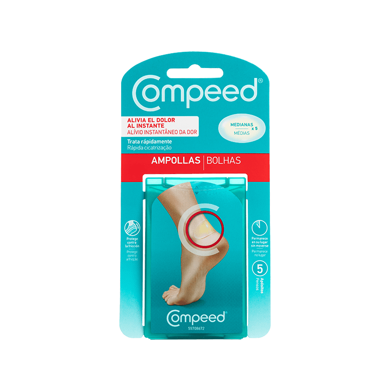 El apósito para ampollas medianas COMPEED® proporciona un alivio del dolor al instante, formando un acolchado reforzado que protege la zona a la vez que absorbe el exceso de fluido y crea unas condiciones de curación óptimas para las ampollas del pie.