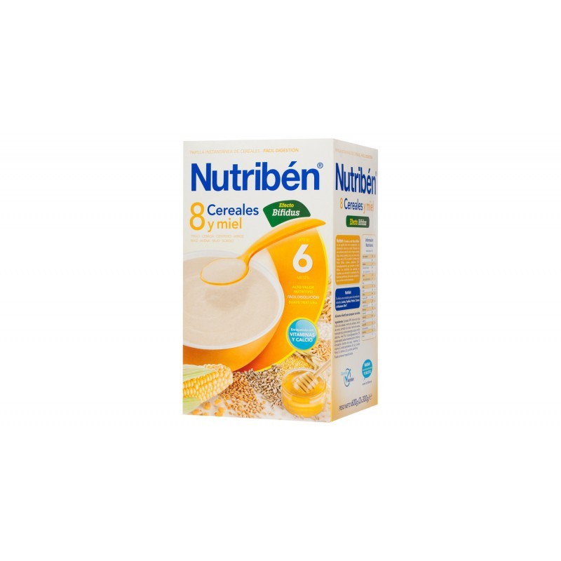 ANÁLISIS MEDIO Por 100 g: Proteínas: 5,4 g Hidratos de carbono: 85,5 g - azúcares: 25,5 g Lípidos: 2 g - saturados: 0,41 g Fibra Alimentaria: 3,8 g VITAMINAS Y MINERALES Vitaminas: Vitamina A (Retinol): 420 mcg Vitamina D3 (Colecalciferol): 7,5 mcg Vitamina E (Tocoferol): 5 mg Vitamina C (Ácido Ascórbico): 30 mg Vitamina B1 (Tiamina): 0,60 mg Vitamina B3 (Niacina): 5,0 mg Vitamina B6 (Piridoxina): 0,36 mg Vitamina B9 (Ácido fólico): 50 mcg Biotina: 12 mcg Ácido pantoténico: 2,5 mg Vitamina K: 25 mcg Minerales: Sodio: 8 mg Calcio: 160 mg Fósforo: 164 mg ENERGÍA 389 Kcal / 1650 kJ MODO DE EMPLEO Poner en un plato la cantidad adecuada de leche caliente tal y como se indica en la tabla de dosificación. Añadir en forma de lluvia la cantidad de cucharadas soperas de Nutribén® 8 cereales efecto bífidus indicada en la tabla de dosificación. Remover cuidadosamente con un tenedor hasta obtener una papilla homogénea.