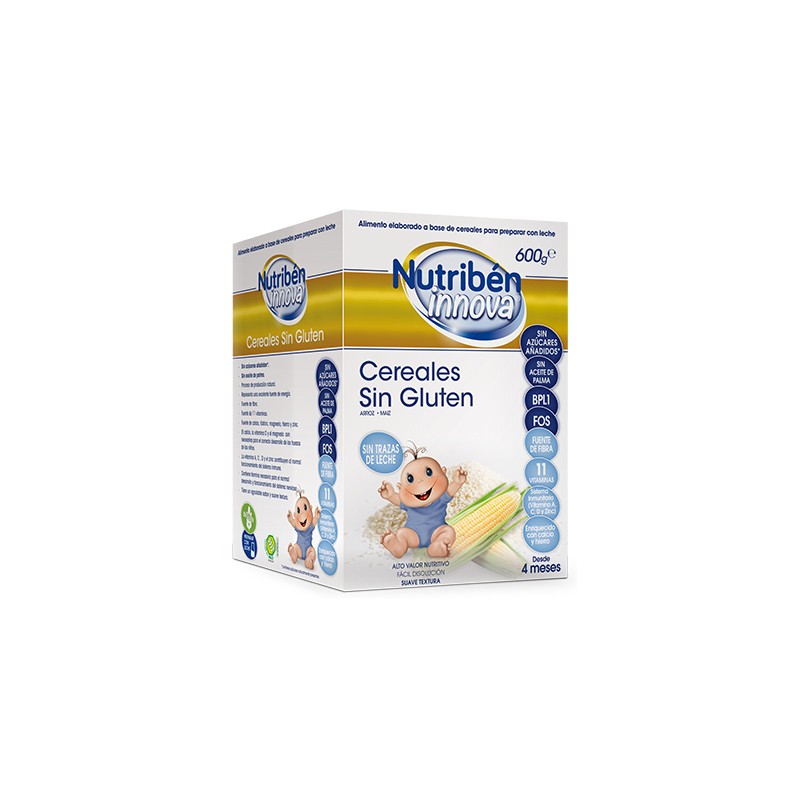 Los cereales Nutribén Innova® Sin Gluten presentan un alto porcentaje de cereales, que son una importante fuente de energía y un alimento básico en la dieta infantil. Compuesto por 2 cereales: maíz y arroz.