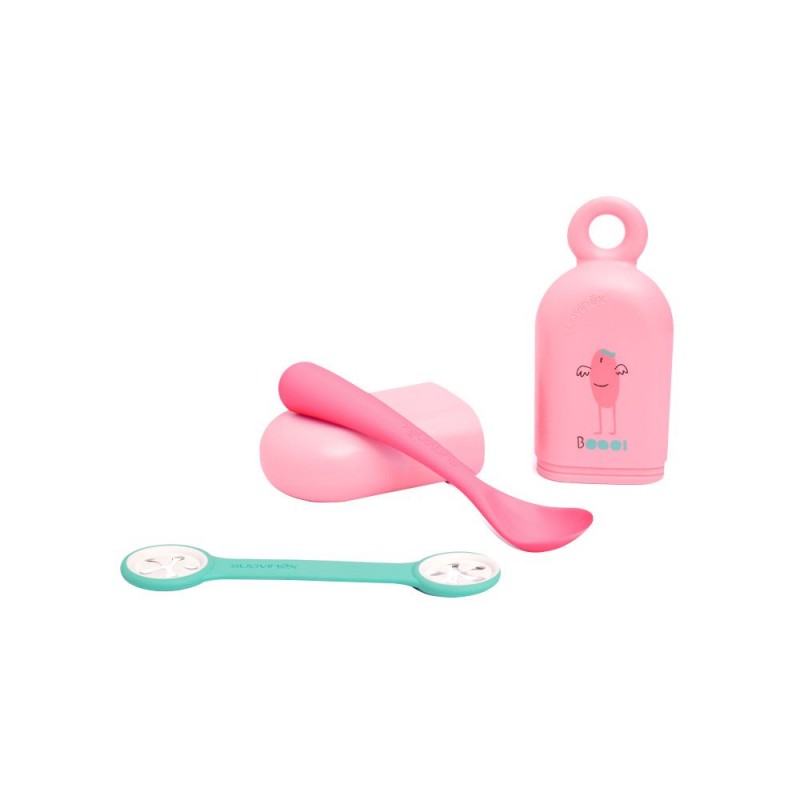 Está compuesto por una cuchara ergonómica pensada para papillas y potitos, un portacucharas con capacidad para transportar 2 cucharas y tenerlas siempre a mano, y un sujetababeros que permite convertir una simple servilleta en un improvisado babero.