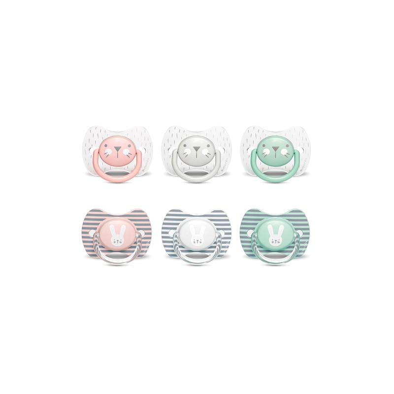 Con tetina fisiológica silicona. De forma plana y simétrica queda siempre correctamente colocada en la boquita del bebé, ejerciendo la mínima presión sobre el paladar.