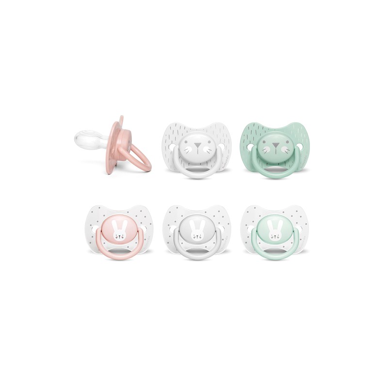 Con tetina fisiológica silicona. De forma plana y simétrica queda siempre correctamente colocada en la boquita del bebé, ejerciendo la mínima presión sobre el paladar.