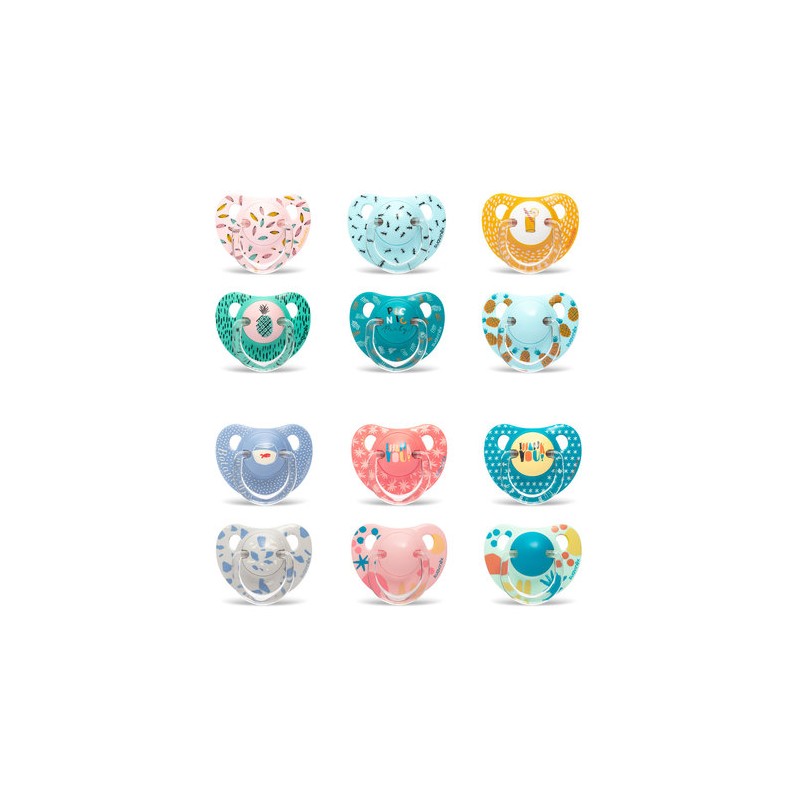 Pack de dos chupetes de la colección Prêt-à-porter de Suavinex con tetina anatómica para bebés de +18 meses.