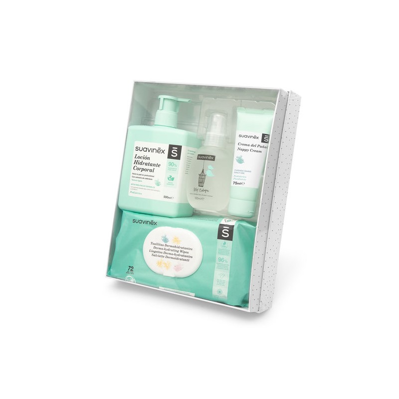 Canastilla Suavinex de regalo con productos de hidratación para bebé.