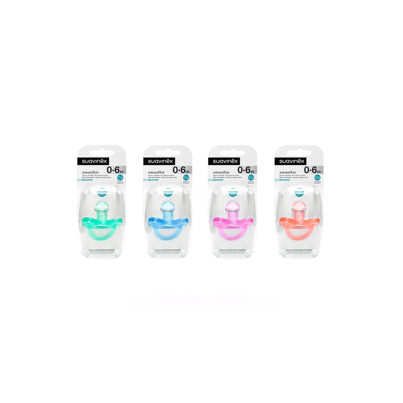 Chupete fabricado en una única pieza de silicona. Su suavidad y flexibilidad, así como su anilla inclinada evitan que estorbe para dormir y deje marcas en la carita del bebé.