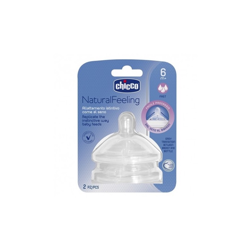 Chicco Natural Feeling Tetina Flujo Rápido 6m es una tetina elaborada en silicona suave de la mayor calidad, con doble válvula anticólicos, para bebes a partir de 6 meses. La tetina está elaborada en siliciona extra suave, del más alto grado, libre de BPA y ftalatos para la correcta alimentación de los bebés, minimizando al máximo el riesgo de alergias. Natural Feeling Tetina Flujo Rápido de Chicco presenta forma alargada para adaptarse a la forma de succión de los bebés más mayores. Tiene una base menos abombada, específica para el correcto apoyo de los labios. Su diseño se completa con anillos en relieve en la base de la tetina que imitan al seno materno, y ayudan a la tetina a ofrecer una mayor elasticidad y flexibilidad. Natural Feeling está concebida para parecerse lo más posible al pecho, haciendo de la lactancia la experiencia lo más natural posible para el bebé. La tetina Natural Feeling de Chicco de flujo rápido es ideal para dar agua, leche o manzanilla a los bebés a partir de los 6 meses.