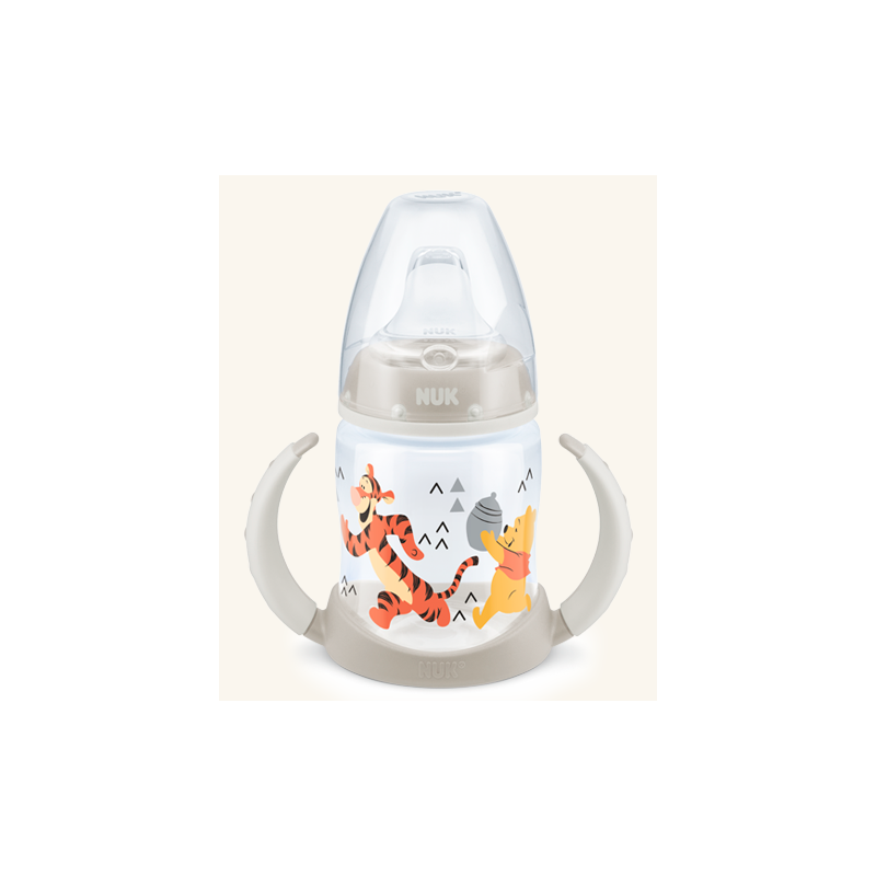 El Biberón FC Entrena 150 ml Winnie the Pooh NUK simplifica la transición del pequeño para empezar a beber solo gracias a la boquilla suave y cómoda hecha de TPE (elastómero termoplástico) con una pequeña ranura que facilita el goteo como parte del proceso natural de aprendizaje.