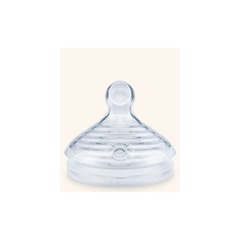 Tetina de silicona con múltiples orificios, simula el pecho materno y proporciona un flujo natural y continuo como en la lactancia materna.