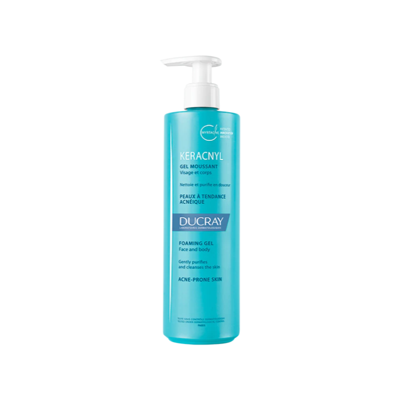 El gel limpiador Keracnyl está enriquecido con Myrtacine® Nueva Generación para actuar en la bacteria responsable de los granos